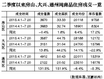 据亚豪机构统计,今年二季度以来,纯商品住房(包括商住,不包括自住房,下同)库存出现了明显的变化。截至7月20日,大兴区库存套数为12172套,与去年同期的15796套相比,降速达到22.9%;通州区的库存为15319套,较之于去年二季度同期16176套,去化速度也达到5.3%。