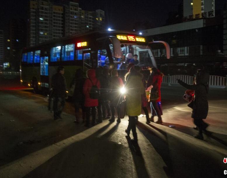 连接北京城区和燕郊的主要公交线路共有9条,每个工作日早高峰,这些公交车都要运送数以万计的上班族去北京不同的城区上班。图为河北燕郊开往北京大望路的公交车下,上班族在寒风中排队上车。