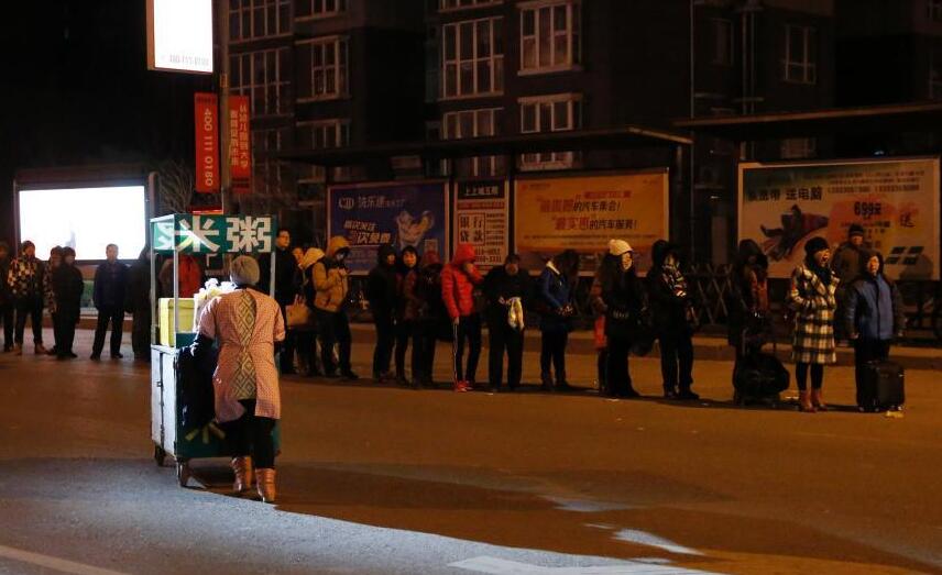燕郊位于潮白河东畔,西与北京市通州区隔河相望。燕郊有多路公交车直通北京国贸,在国贸上班,到燕郊去很方便。图为燕郊上上城五期公交站前,卖早点的小贩赶到排队前往北京大望路的人群中,他们即将迎来当日的首班车,到达国贸只需要1个小时。