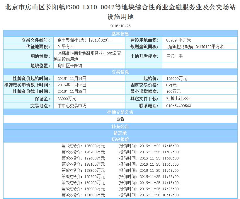现场竞拍前,房山区长阳镇FS00-LX10-0042等地块综合性商业金融服务业及公交场站设施用地在国土资源局共收到9次网上报价,分别是:万科、富力、远洋、华远、石榴、中粮+万科+天恒联合体、龙湖+首开、新城、安邦,较高报价为13.16亿元。