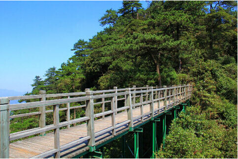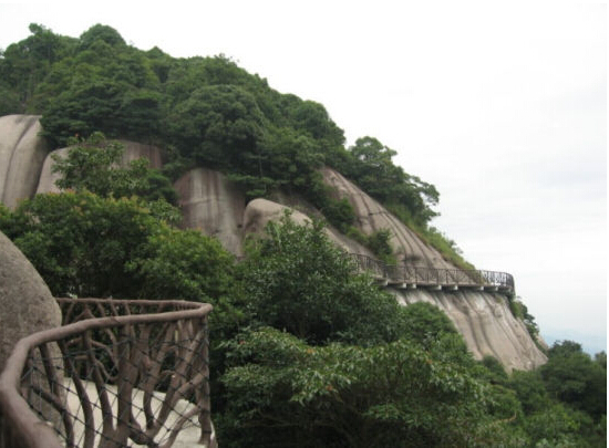 悬空栈道如带子般缠绕在岩石上,在此可观太姥山山海相连的壮美景观。如果清晨登山,雾气还未散去,人走在悬空栈道上犹如踩在云端。