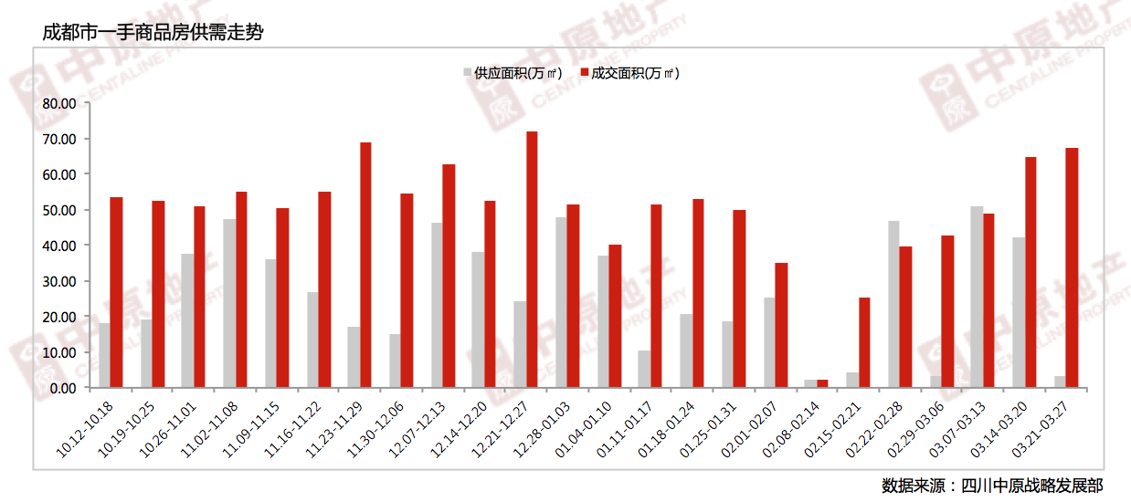 据四川中原监测数据显示,上周成都市商品房供应面积3.08万㎡ ,环比下跌92.73%;商品房成交面积67.21万㎡,环比上涨4.00%。