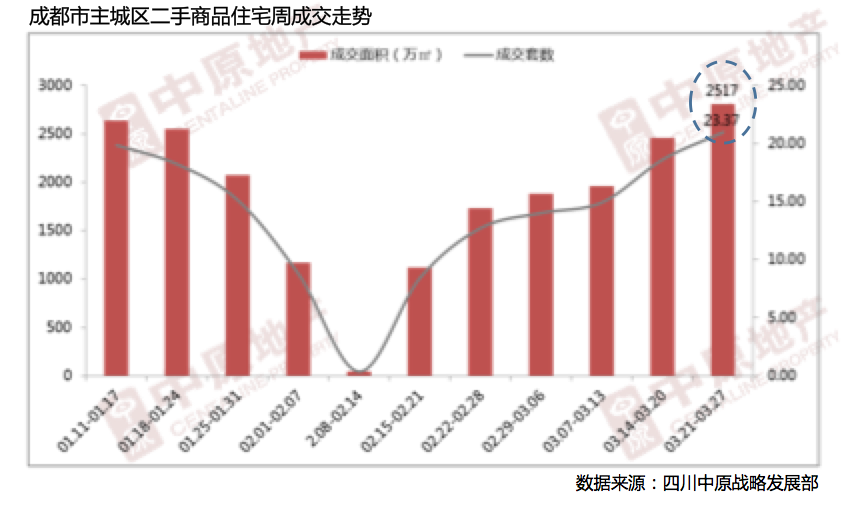 上周主城区二手住宅成交2517套,环比上涨12.62%;成交面积为23.37万平方米,环比上涨13.94%;上周成交量在上上周的基础上再次上涨,创近一年以来的高位水平,至此3月“小阳春” 终成定局。近期,一线城市及部分二线城市开始收紧调控,或对买卖双方置业心理造成一定影响,但市场总体形势依然向上,特别是受利好政策影响改善性需求的积极入市将持续影响楼市保持高位。