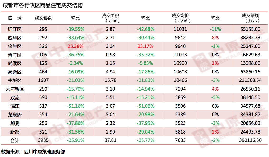上周除高新区与上上周持平外,其余各行政区均环比下降。其中,青羊区和成华区环比下降幅度约20%,分别成交342套、355套;金牛区和锦江区环比下降超10%,分别成交424套、291套;武侯区环比下降8.55%,成交396套。