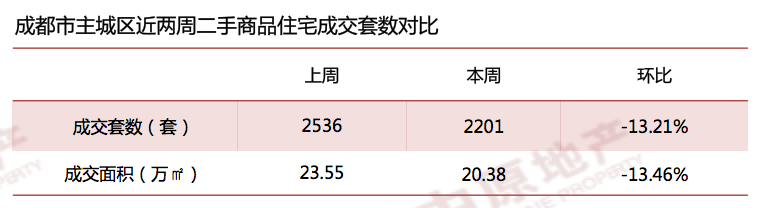 上周主城区二手住宅成交2201套,环比下降13.21%;成交面积为20.38万平方米,环比下降13.46%;