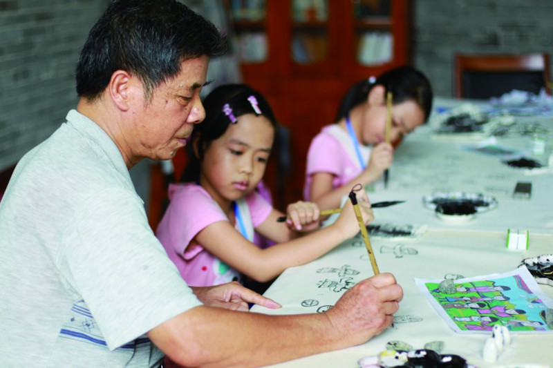 7月24日,三水白坭祠巷村陈氏大宗祠内,老师正在教小朋友画画。