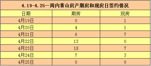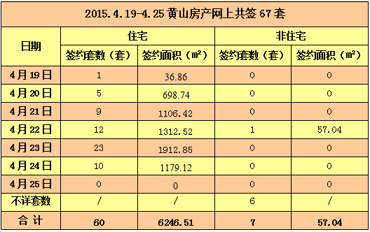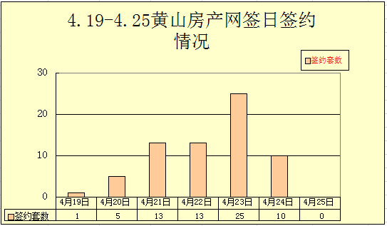 在2015年4月19日—4月25日一周内,黄山房产市场房源单日签约量较高的为4月23日,签约25套,签约面积为:2096.97平米;第二名是4月21日,签约13套;第三名是4月22日,签13套。