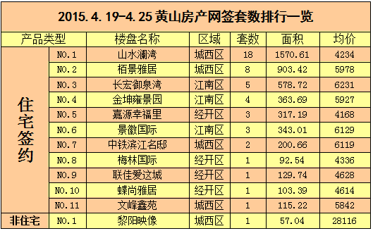 据黄山搜狐焦点网统计,2015年4月19日—4月25日,黄山房产住宅签约冠军为山水澜湾,签约18套房源,签约面积为:1570.61平米,签约均价为:4234元;第二名为栢景雅居,签约8套房源;长宏御泉湾也签约5套房源,排名第三。