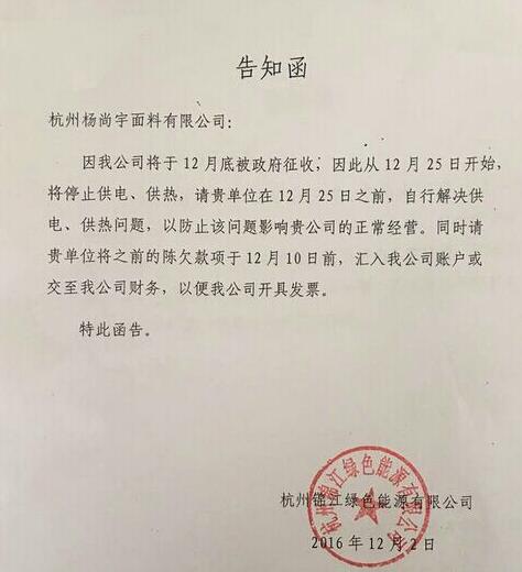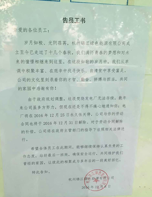 近日,一则关于《乔司的垃圾焚烧电厂真的要搬了 12月25日永久性关停!》的帖子在网络上盛传。发帖人上传了一张杭州锦江绿色能源有限公司的“告员工书”为证,内容则是:由于政府规划调整,垃圾焚烧发电厂无法存续……电厂将在2016年12月25日永久性关停。那么,发帖人说的消息是否属实?随后,记者拨打了杭州锦江绿色能源有限公司的电话进行求证。