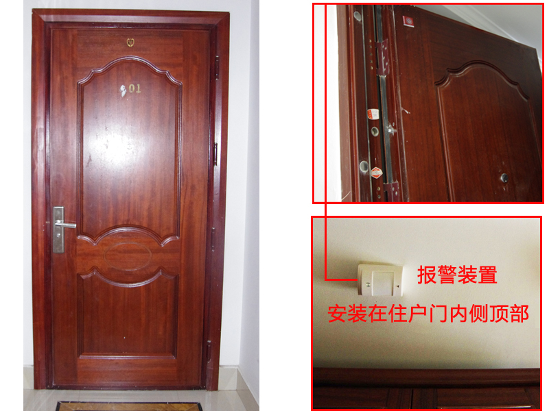 业主入户门内侧墙顶位置,安装了报警装置,当入户门被非正常手段(例如撬开、爆破等)打开时,该安全报警装置便会启动,连接物业系统,物业工作人员会立即查看到是否有突发情况。
