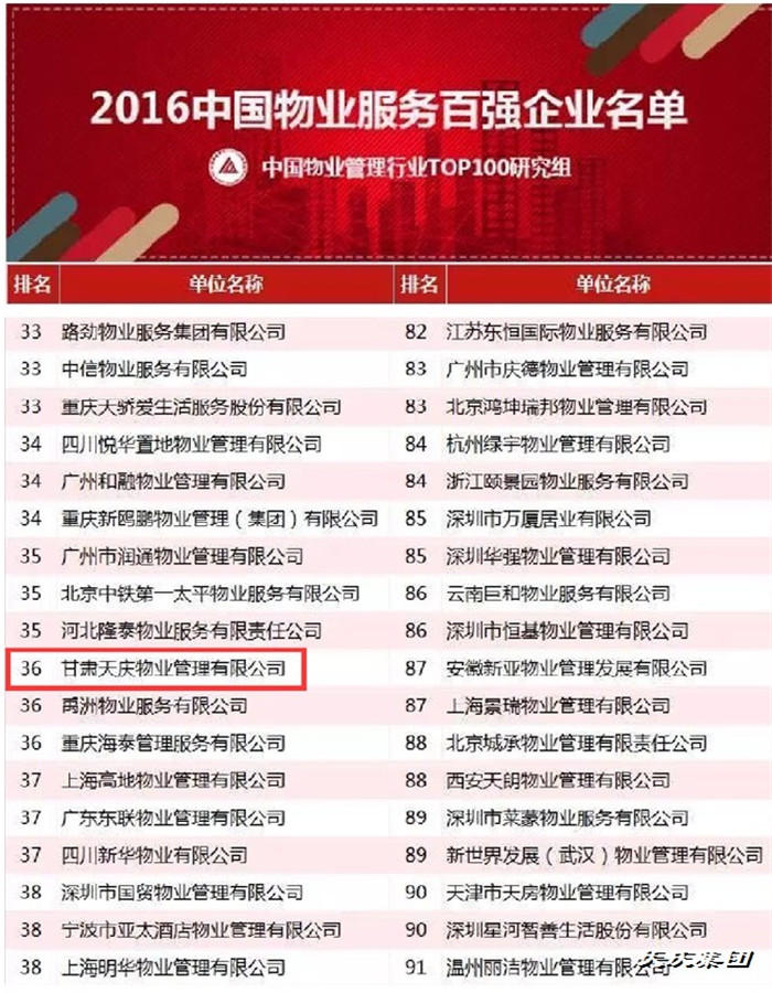 2016年6月21日,《2016中国物业服务百强企业研究报告》在京发布,在天庆物业人的共同努力下,天庆物业再次入围全国物业管理综合实力百强企业,排名第36位。