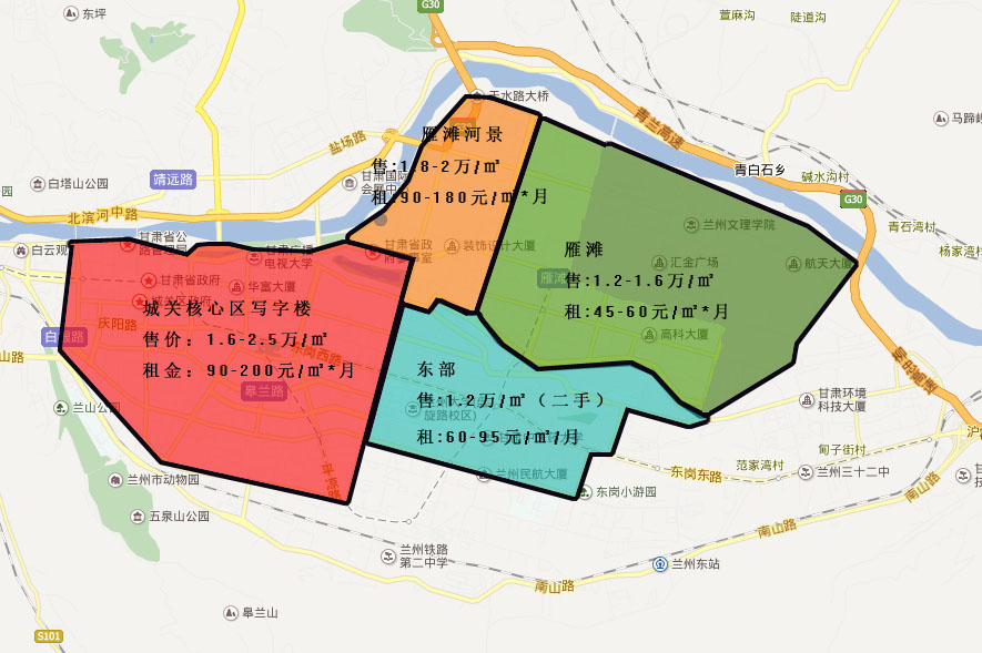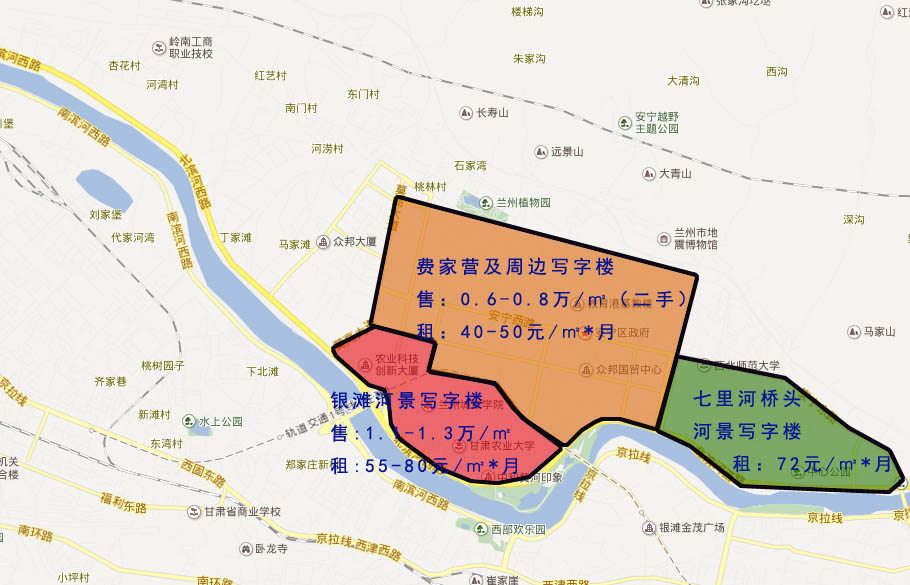 数据显示,城关区写字楼项目的交房时间集中在2017年前后,届时城关区将有75万平写字楼可入住,按照目前兰州企业的人均写字楼面积不到15平米计算,2017年城关区至少有供5万人的办公空间投入使用;七里河区多个商业综合体项目入驻,有望成为未来商业地产的密集区域,安宁区重启中央商务区项目和大量的河景商务综合体项目亮相,办公面积大幅增加;西固区在建大型出城入园改造项目——西固金融街,规划大面积的总部经济、银行办公大楼、中小企业办公楼,同样不容小觑。