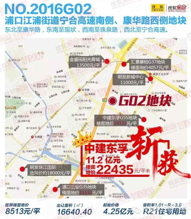 江浦地价也是让人忧心,今年3月18日,中建东孚再造地王,NO2016G02楼面地价达到22435元/平,而当时周边的项目明发珠江国际放风售价为18000元/平,远一些的正荣润江城房价当时也只站到了21500元/平。
