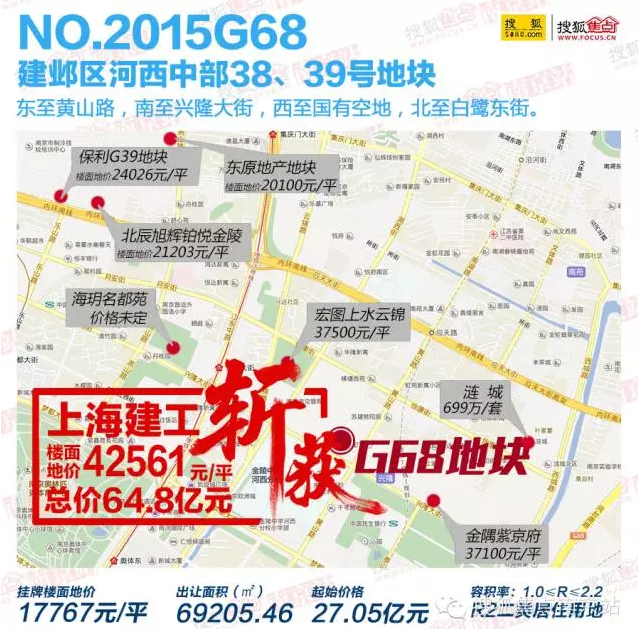 说到地价超房价,不得不说河西中部。今年1月29日,上海建工拿下NO2015G68地块,地价一举破4万,达到42561元/平,成为南京市地王,而当时河西中部的房价较高为宏图上水云锦,售价37500元/平。