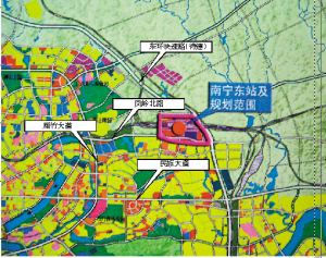 为了方便交通和今后旅客进出东站,《规划》将东站周边地区打造成“一轴两心三片区”:“一轴”即贯穿南北广场及高铁站房的空间主轴;“两心”指南宁东站南广场、北广场两个景观中心;“三片区”分别指北部配套功能区、中部铁路场站片区、南部配套功能片区。
