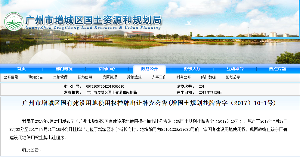【搜狐焦点广州讯】今日(7月26日)下午,增城区国土资源和规划委员会发布公告,中止永宁街长岗村A17083商住用地的出让。该地于6月27日挂牌,原定于下周一(7月31日)现场竞价出让,而现在宣布因故终止该宗国有建设用地使用权挂牌出让程序。