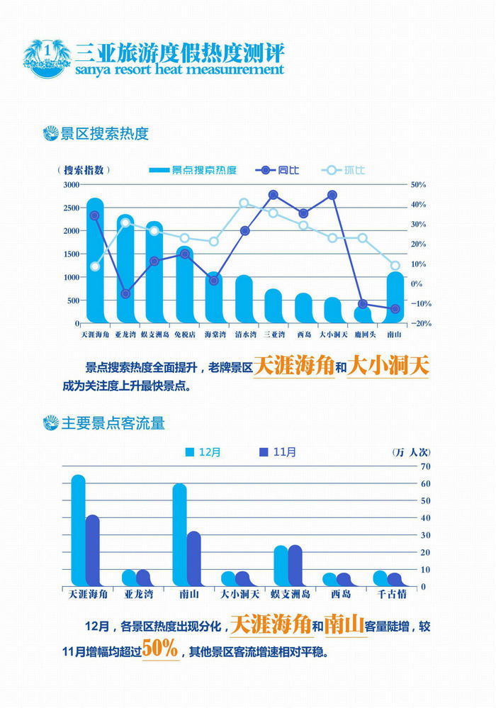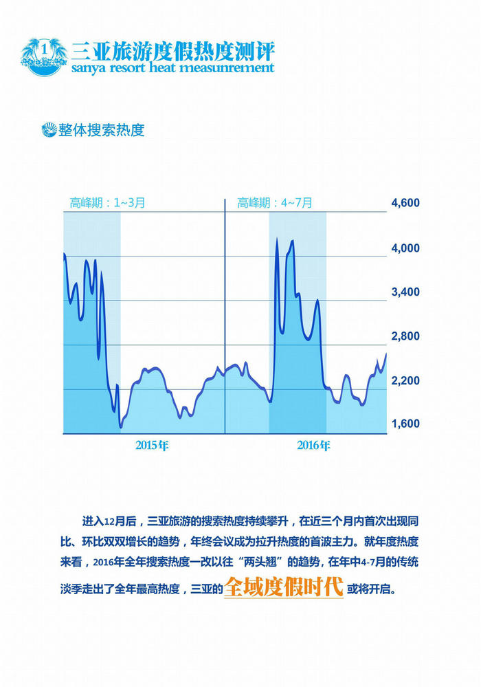 进入12月后,三亚旅游的搜索热度持续攀升,在近三个月内首次出现同比、环比双双增长的趋势,年终会议成为拉升热度的首波主力。就年度热度来看,2016年全年搜索热度一改以往“两头翘”的趋势,在年终4-7月的传统淡季走出了全年较高热度,三亚的全域度假时代或将开启。