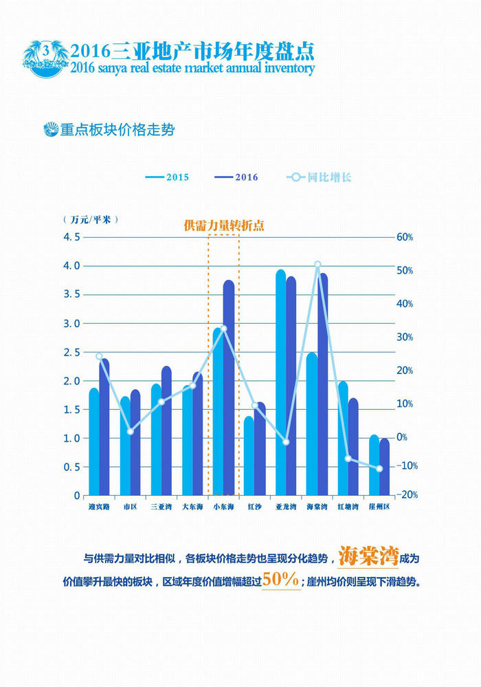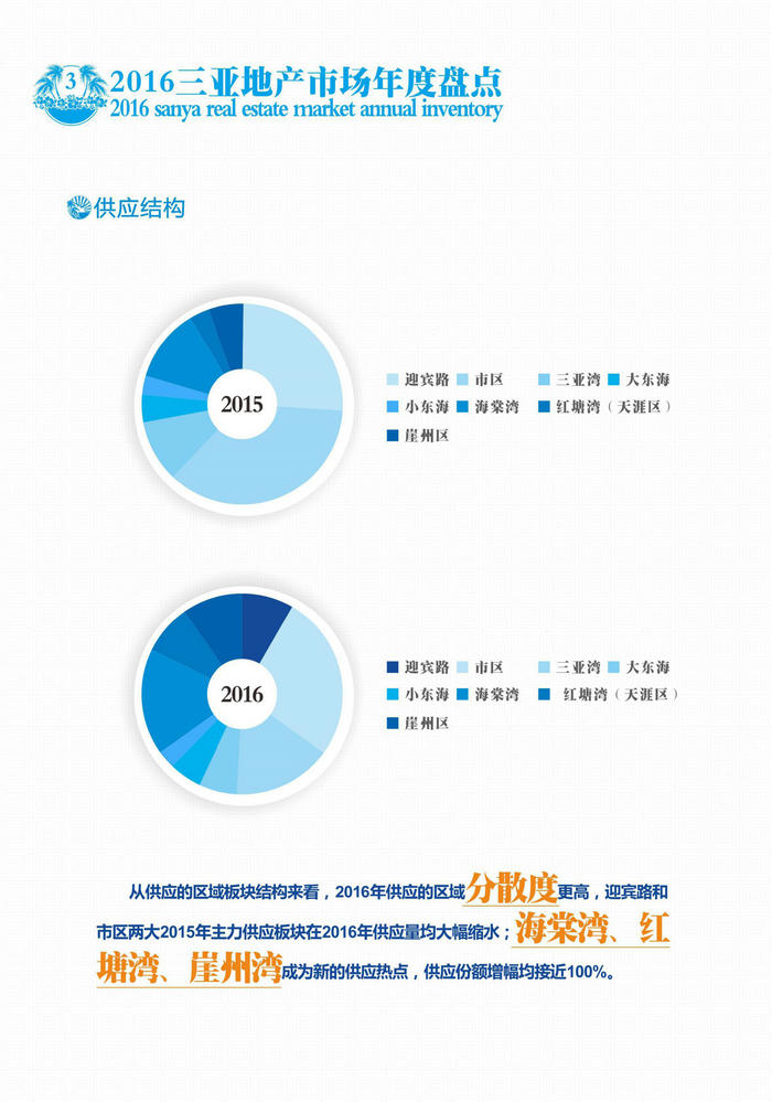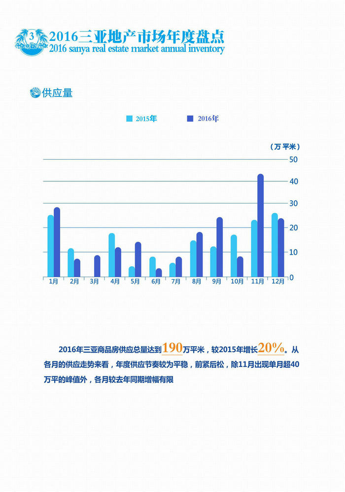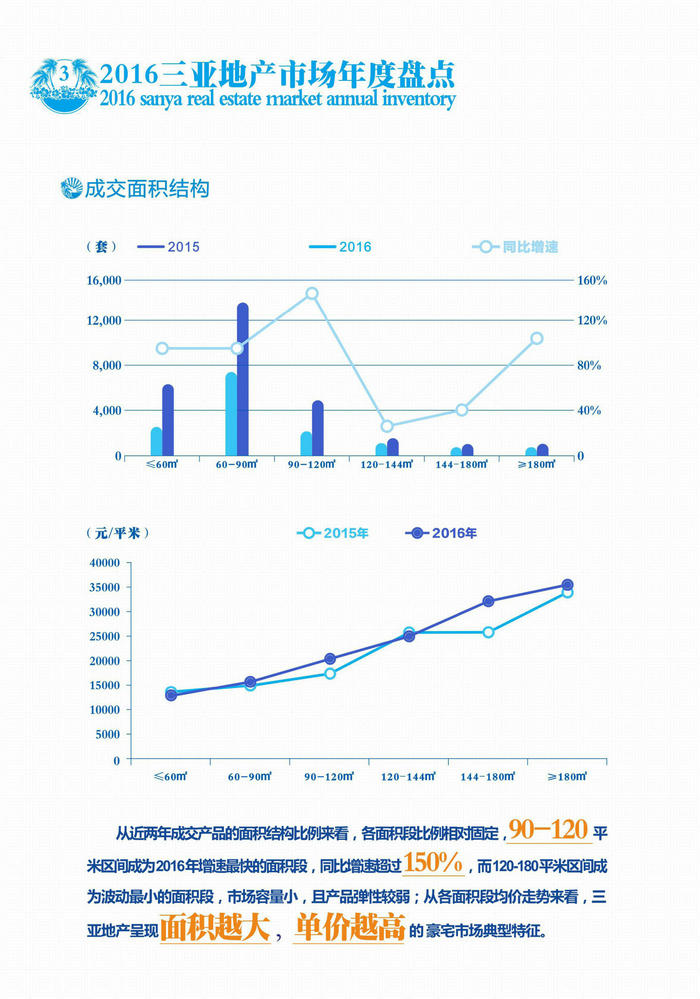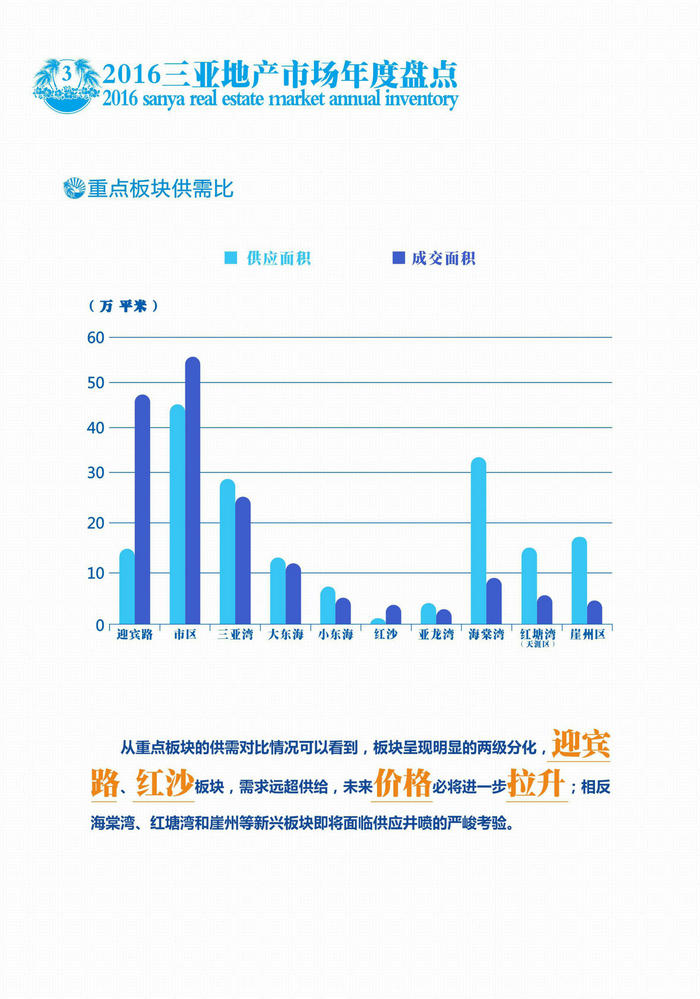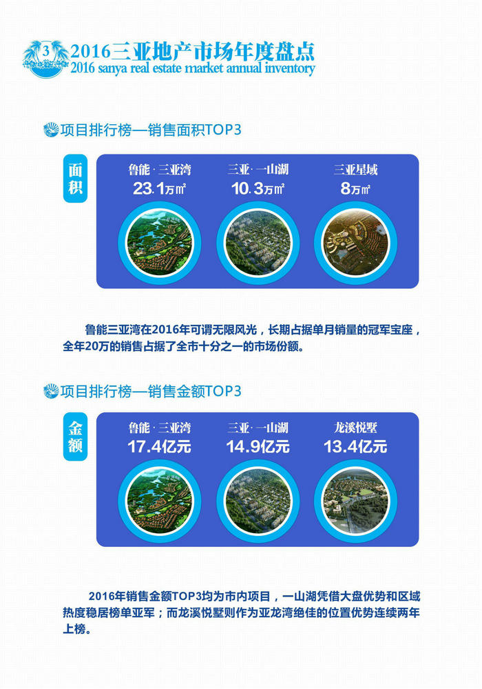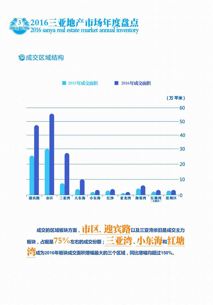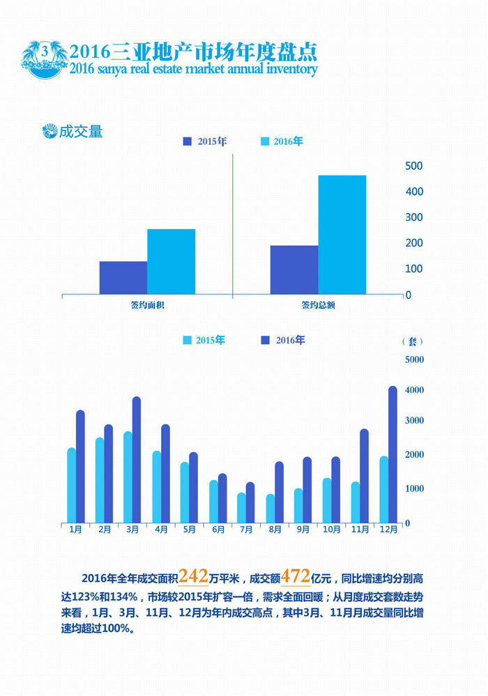 2016年全年成交面积242万平米,成交额472亿元,同比增速分别高达123%和134%,市场较2015扩容一倍,需求全面回暖。鲁能三亚湾、三亚一山湖、三亚星域分别摘取了2016三亚年度成交面积冠亚季军。