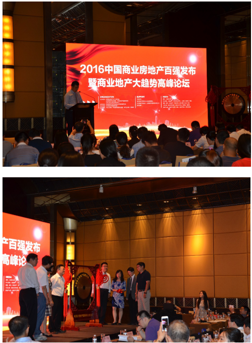 2016年8月19日,由全国房地产商会联盟、中国房地产数据研究院、北京大学人文经济研究中心三家单位共同组织的中国商业房地产TOP100研究组,在上海金茂大厦发布《中国商业房地产百强研究成果发布会暨商业地产模式创新高峰论坛》。出席嘉宾包括复旦、财大、同济、社科院四大教授学术鼎力支持;万达、万科、金地、协信、瑞安、鹏欣、仁恒、华润、中粮、旭辉、中海等众多商业百强企业总裁及管理层,众多行业知名商业开发企业、商业招商运营企业、设计单位以及商业配套智能家居企业参加,围绕着当前商业地产现状、模式、转型以及创新,探讨了中国商业地产的未来之路。