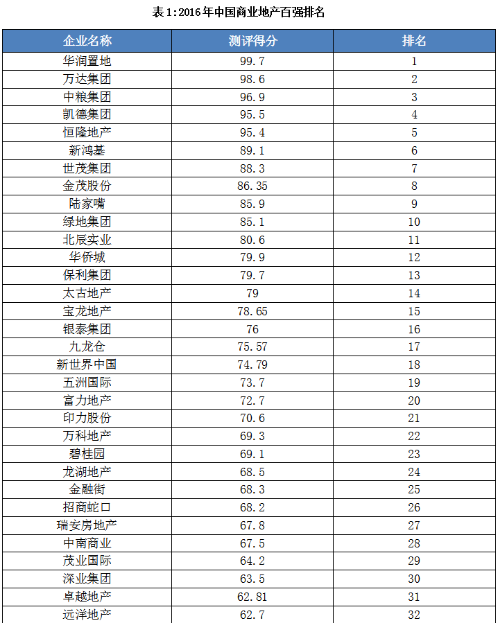 2016商业房地产百强发布,华润、万达、中粮荣获前三甲