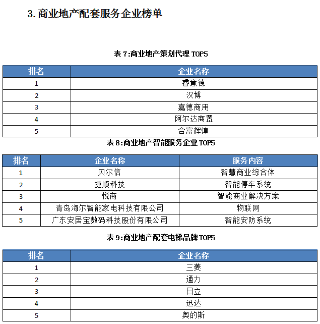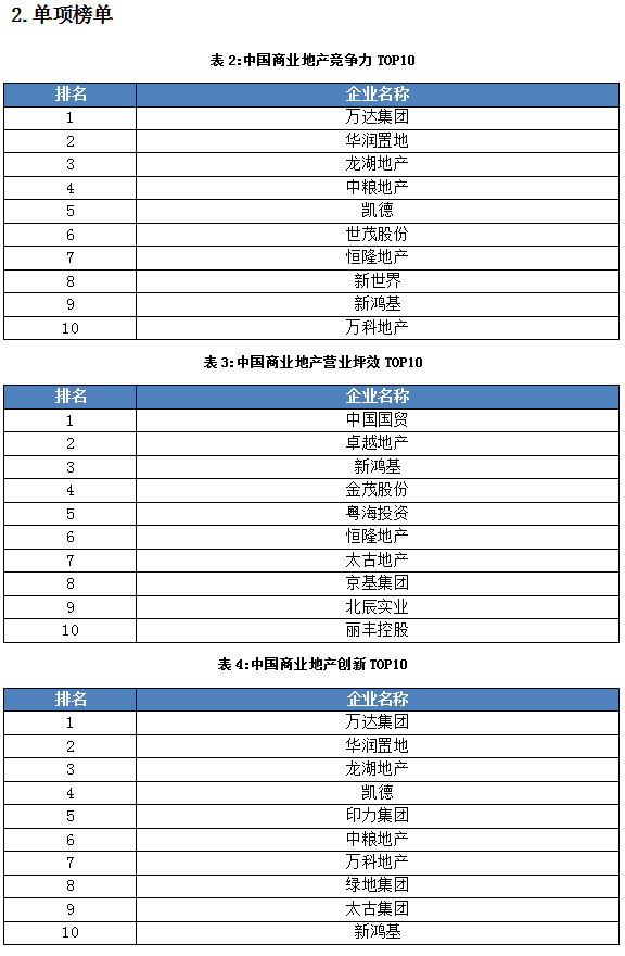 在本次商业地产百强发布会上,中国商业房地产Top100研究组发布了商业地产百强的名单,同时研究组还对商业地产企业进行单项奖测评以及对商业地产配套服务企业测评。其中,单项奖涉及商业地产竞争力TOP10、商业地产营业坪效TOP10、商业地产创新TOP10、商业地产成长性TOP10、商业地产成熟产品线TOP10;配套服务企业涉及到商业地产策划代理公司TOP5、商业地产智能服务企业TOP5以及商业地产配套电梯品牌TOP5。通过不同维度以及不同方面的测评,可以充分挖掘不同商业地产企业优秀品质,避免了单靠规模或者营业收入来衡量企业能力的弊端。