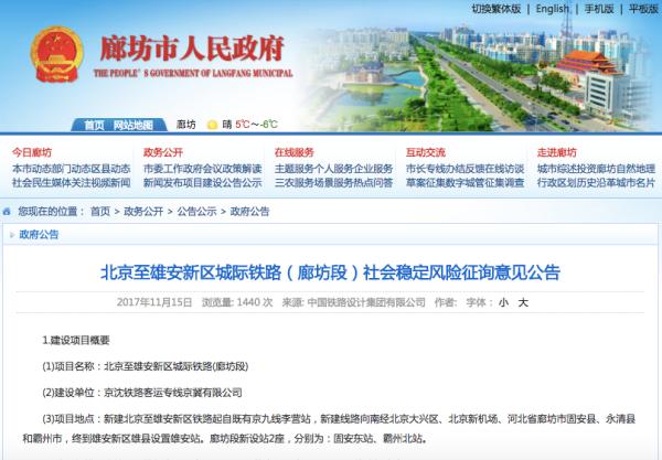 河北廊坊市政府网站有关北京至雄安新区城际铁路(廊坊段)的征询意见公告