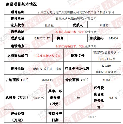 搜狐焦点“楼市快讯”报道:近日,搜狐焦点获悉,高新区政府网站发布了《关于石家庄旭苑房地产开发有限公司北方科技广场(东区)项目环境影响报告表的公示》。