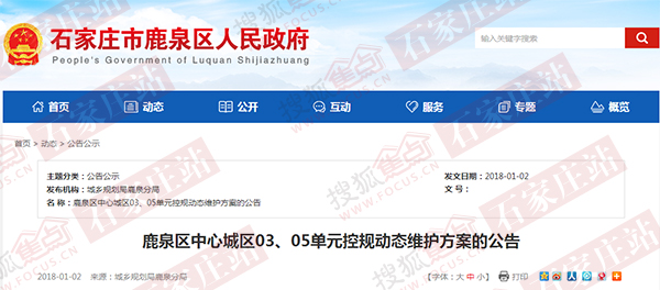 搜狐焦点“楼市快讯”报道:近日,搜狐焦点从鹿泉区政府网站获悉,石家庄市城乡规划局鹿泉分局发布了《关于公开展示鹿泉区中心城区03、05单元控规动态维护方案的公告》。