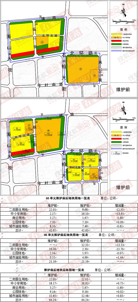 03单元地块,维护前:用地总面积42.65公顷,其中二类居住用地22.01公顷,中小学用地2.17公顷,商业用地3.27公顷,公园绿地7.10公顷,城市道路用地8.10公顷。维护后:用地总面积42.65公顷,其中二类居住用地9.68公顷,中小学用地16.62公顷,商业用地1.67公顷,公园绿地7.19公顷,城市道路用地7.49公顷。
