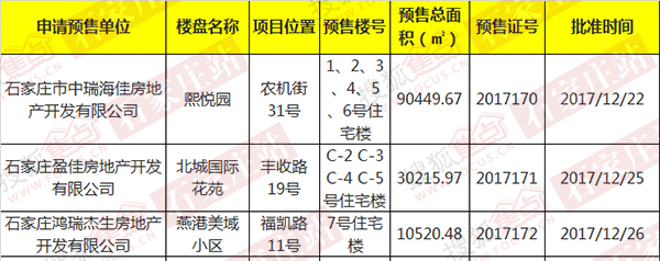 搜狐焦点“楼市快讯”报道:近日,搜狐焦点获悉,石家庄市行政审批局发布了3张商品房预售许可证,获取预售证时间为12日22至12日26日。具体来看,涉及项目包括熙悦园、北城国际花苑、燕港美域小区等3大项目,总预售面积为131186.12平方米。